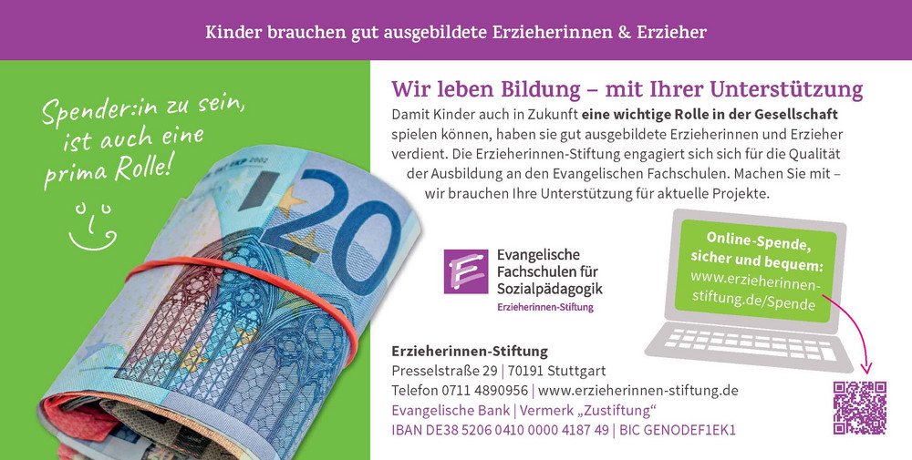 Damit auch in Zukunft an Evangelischen Fachschulen Erzieherinnen und Erzieher ausgebildet werden können, brauchen wir Ihre Mithilfe! Es gibt verschiedene Formen der Unterstützung, die alle steuerlich abzugsfähig sind.